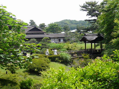 Dans le jardin, sont dispersés d’autres bâtiments comme le Tenzuiji Juto Oido provenant du Daitokuji de Kyoto. Il fut construit en 1 591 par Toyotomi Hideyoshi, le général qui unifia le Japon en 1 590, pour célébrer la longue vie de sa mère. Après le pont Teisha se trouve le Choshukaku (1 623) un bâtiment possédant une forme étrange qui provient de Nijojo (Kyoto). Plus loin un complexe de 3 bâtiments : le Gekkaden (1 603) qui provient du château de Fushimijo (Kyoto), le Tenjuin (1 603) qui provient de Jizodo près du temple de Kenchoji de Kamakura, et Kinmokutsu (1 918), la maison de thé de Sankei.
